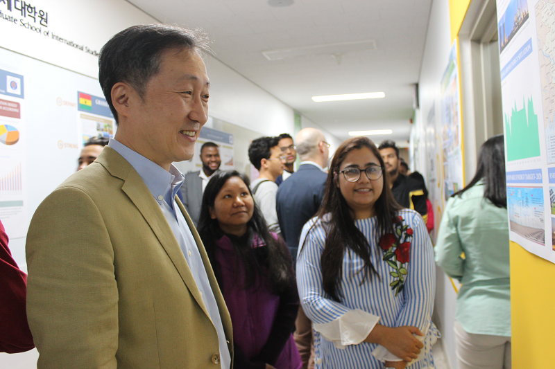 우리 학교 국제대학원이 10일 율곡관에서 '제3회 Share Your Country' 행사를 열었다.이번 행사는 국제대학원 재학생들이 출신 국가의 현황과 현안에 대한 정보를 담아 포스터 세션 형태로 진행했다. 네팔과 라오스, 몽골, 알제리, 에콰도르, 이란, 짐바브웨, 케냐, 키르기스스탄 등 20개국에서 온 유학생들이 참여했다.국제대학원 학생들은 본인이 전공하고 있는 내용을 중심으로 각국의 사례를 정리하고 개선안을 제시하는 포스터를 구성했다. 특히 한국국제협력단(KOICA) 연수생들로 구성된 융합에너지학과 학생들은 전원 참가해 자국의 에너지 산업과 정책에 대해 소개했다.김병관 국제대학원장을 비롯해 김형택 코이카 지도교수, 경영학과 Troy Felver 교수, NGO·국제개발협력학과 Iain Watson 교수 등이 행사에 참여해 학생들의 발표를 듣고 격려했다. 김병관 국제대학원장은 "포스터 발표 형식으로 자국의 현황을 글로벌 현안에 맞추어 발표하고 공유할 기회를 가진 의미 있는 행사"라며 "프로그램에 참가한 학생들이 귀국 후 전문가로서 본국의 발전에 이바지 하는데 있어 오늘이 값진 첫걸음이 되기를 바란다"고 말했다. 우리 학교 국제대학원에는 국제경영학과와 국제통상학과, NGO학과, 국제개발협력학과, 융합에너지학과 5개의 학과가 운영중이고, 세계 38개국의 220여명 학생이 석사과정에 재학중이다.