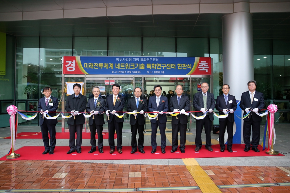 ‘미래전투체계네트워크 기술 특화연구센터(센터장 임재성)’가 10일 개소식을 가지고 본격적인 활동에 들어간다. 개소식은 장명진 방위사업청장, 김인호 국방과학연구소장 등이 참석했고, 우리학교에서는 김동연 총장, 김태영 교수(전 국방장관), 임재성 특화연구센터장 등이 참석한 가운데 오후 3시30분부터 다산관 강당과 종합관 정문에서 열렸다. 개소식은 특화연구센터 개소 과정에 대한 경과보고, 연구센터 위촉장 수여, 김동연 총장의 환영사, 장명진 방위사업청장과 김인호 국방과학연구소장의 축사, 특화연구센터 소개, 현판식 등의 순서로 진행됐다. 방사청은 국방 분야의 핵심기술 확보와 우수 연구인력의 국방연구개발 참여를 유도하고자 대학과 정부 출연 연구소를 선정해 연구하는 특화연구센터 설립을 지원하고 있다. 특화연구센터에서는 앞으로 우리 학교를 중심으로 국내 학계의 관련 전문 연구 인력을 결집, 국방 분야 응용 연구에 필요한 원천 기술 및 인적 역량 구축을 진행할 계획이다. 우리 학교가 주도하는 특화연구센터에는 고려대, 성균관대, 카이스트, 숭실대 등 13개 학교가 함께 참여한다. 김동연 총장은 환영사에서 “우리 대학은 국방 분야에 특화된 학교다. 오늘 특화연구센터 개소를 통해 기존에 갖추고 있는 학과, 연구소의 역량이 합쳐져 시너지를 낼 것으로 기대한다”며 “앞으로 학교의 관심과 지원을 아끼지 않을 것을 약속한다”고 말했다. 장명진 방위사업청장은 축사를 통해 “방위사업청은 특화연구센터에 2022년까지 6년간 111억원을 투입해 유·무인 전투체계를 연결하는 전송체계와 적의 통신 교란에 대응하는 통신신호처리, 미래 전장대비를 위한 신매체 전송 기술 등 우리나라에 최적화된 전술네트워크 원천기술을 확보할 계획이다”고 밝혔다. 이어서 축사를 한 김인호 국방과학연구소장도 “특화연구센터 개소를 축하한다. 연구가 원활히 진행되도록 지원을 아끼지 않겠다”고 말했다.