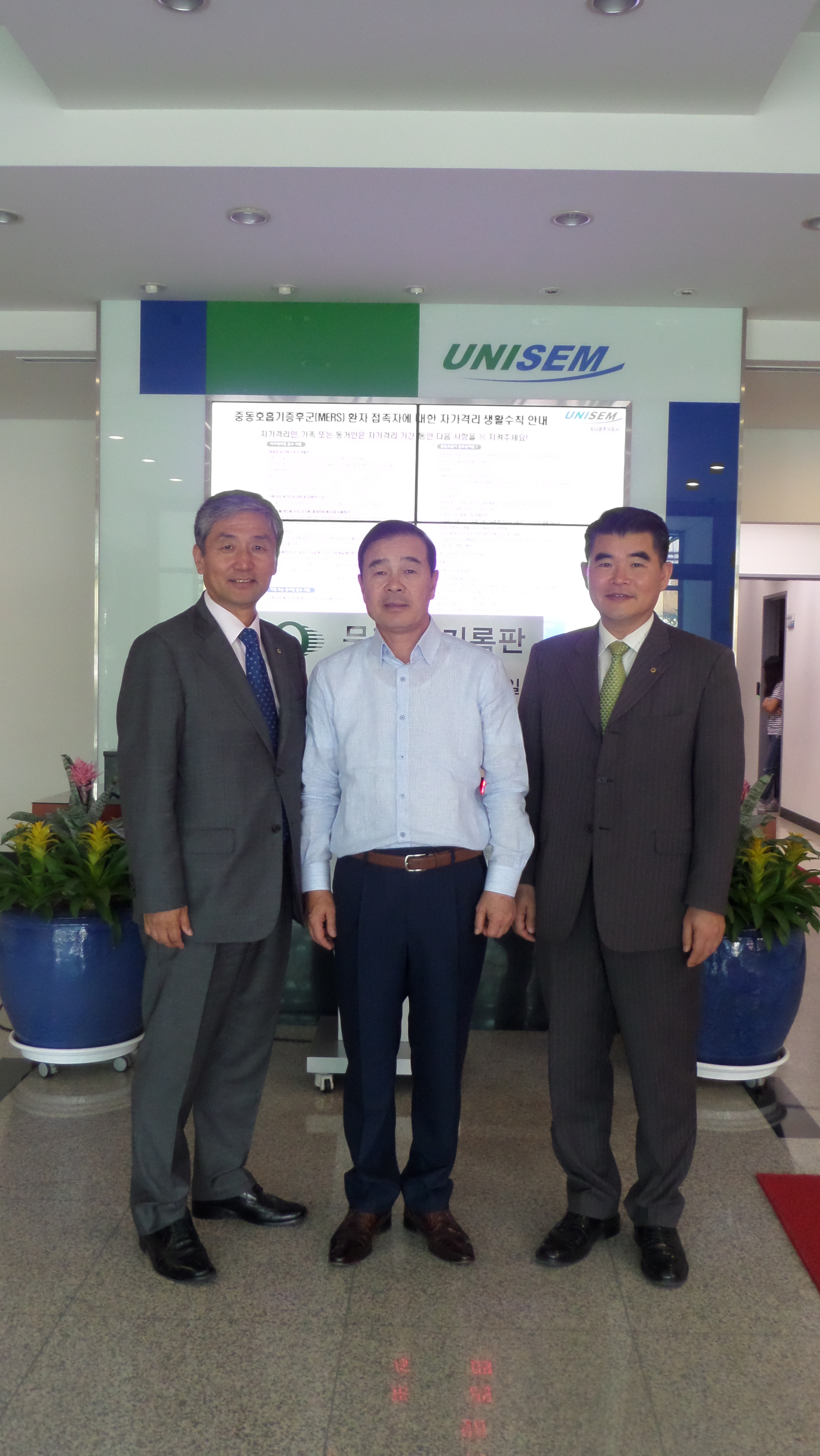 좌측에 김형* 동문 방문대상자 성 함 : 김형* 대표이사(경영대학원 최고과정 34기) 소 속 : 유니셈주식회사 방문자 성명 : 김윤기(대학발전본부장), 이강준, 황원복(대학발전본부) 방문일시 : 2015년 6월 09일 11시 00분 방문장소 : 유니셈주식회사( 경기도 화성시 동탄면 장지남길 10-7 ) 유니셈주식회사는 최첨단 반도체 장비 개발과 미래 환경을 연구하는 기업으로 1988년 11월에 설립된 유니온산업이 모체이다. 2000년 4월에 상호를 변경하였고, 2001년 3월 동탄 공장을 신축하여 이전하고 자리를 잡았다. 1996년 5월 반도체 제조과정 시 발생되는 유해가스를 기존의 수 처리 방식이 아닌 열에 의한 분해방식으로 전환할 수 있는 GAS SCRUBBER 개발에 성공하였고, 삼성전자, LG디스플레이, SK하이닉스 등 업체와 거래하며 반도체 장비산업에 진출하였다. 현재, 유니셈의 첨단기술은 미국, 중국, 대만 등 해외에서도 인정받아 100여명의 해외인력과 지사 설립을 통한 수출로 이어지고 있다. 1996년 8월에는 반도체 장비 온도제어용 Chiller 개발을 완료하였고, 2003년 휴대폰용 카메라 모듈 등을 계속적으로 연구, 개발하였다. 카메라 모듈의 경우 현재에는 블랙BOX 및 보안용 카메라 등 고사양 카메라를 주로 생산하고 있다. 지속적인 연구개발 노력과 세계적인 첨단 기술력은 국내외적으로 인정받아 기존의 ISO 9001 품질경영시스템 인증과 S-Mark인증에 더하여 ISO 27001 국제정보보호경영시스템 인증 등 5건의 국제표준 경영시스템 인증을 추가로 획득하였다. 연간 3,500대의 GAS SCRUBBER와 Chiller를 생산하여 국내외에 공급하고 있으며, 이러한 공로로 2014년 11월 대한민국 기술대상 산업기술진흥유공자 금탑을 수상하였고, 동년 12월 제 51회 무역의 날에는 2000만불 수출탑을 수상하였다. 전년도 기준 930여억원의 매출 실적을 보이고 있으며, 세계적인 기업과 경쟁하기 위한 기술의 격차를 유지하기 위해 350여명의 회사 인력 중 부설연구소의 연구 인력을 65명으로 유지하여 연구분야에 투자를 아끼지 않고 있다. 유니셈의 기술은 반도체 제조장비의 자체개발과 더불어 미래 환경까지도 해결할 수 있는 국가 첨단기술 발전에 초석이 되고 있다. 김형* 동문은 2005년에 경영대학원 최고경영자과정을 졸업하였고, 현재는 아경장학재단의 이사장으로 장학사업을 통한 모교발전과 동문회 발전에 크게 기여하고 있다. 각종 사업규제에 따른 국내 제조업체의 국외 유출을 안타깝게 생각하고 있으며, 청년들의 국내 중소기업 진출을 강하게 희망하고 있다. 인력확보를 위하여 전 직원 자녀의 초,중,고 학비 전액과 대학 등록금 50%를 지원하는 등 다양한 사원복지 정책을 가지고 있으며, 기술과 돈보다 유능한 인재를 우선하는 인간 중심의 경영관과 직위를 막론하고 전 직원은 누구나 실무능력을 갖추고 있어야 한다는 철학을 가지고 있다.