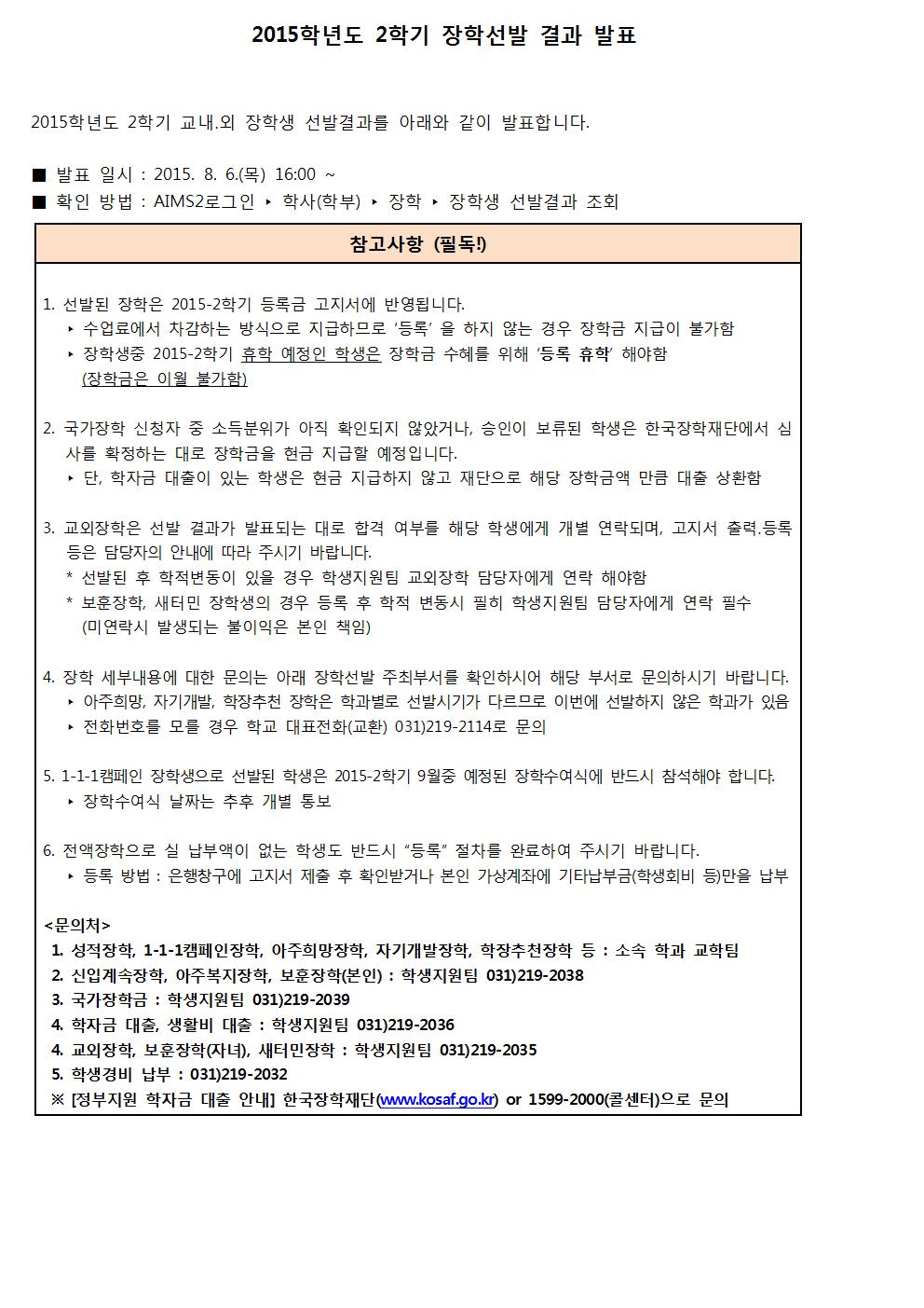 2015학년도 2학기 장학선발 결과 발표