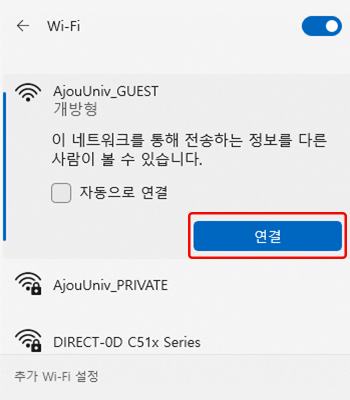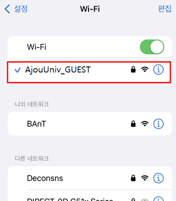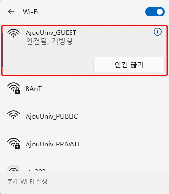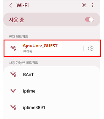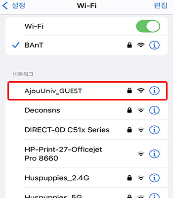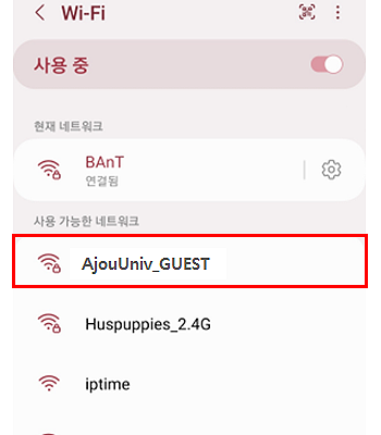 • 2. Wi-Fi SSID 목록 중 “AjouUniv_GUEST” 연결 클릭