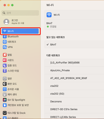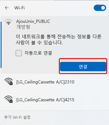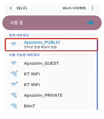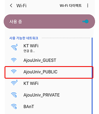 • 2. Wi-Fi SSID 목록 중 “AjouUniv_PUBLIC” 연결 클릭