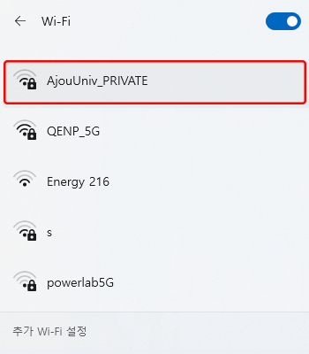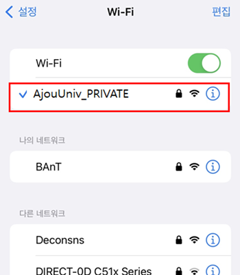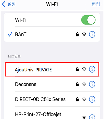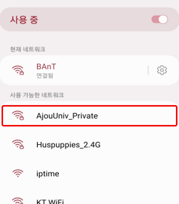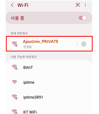 • 3. Wi-Fi SSID 목록 중 “AjouUniv_PRIVATE” 클릭