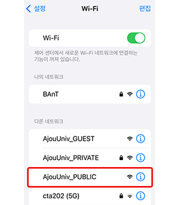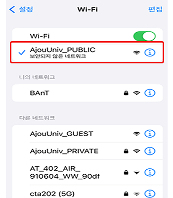 • 4. Wi-Fi SSID 목록 중 “AjouUniv_PUBLIC” 클릭