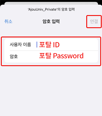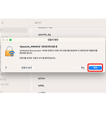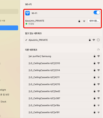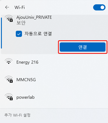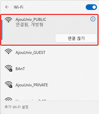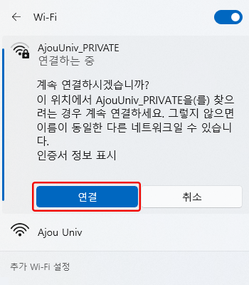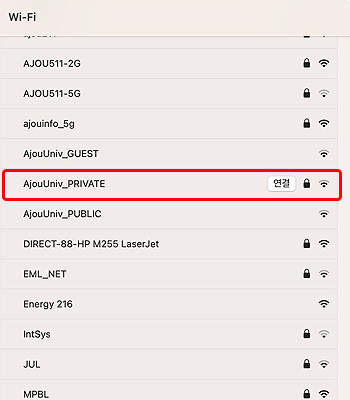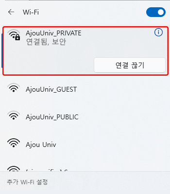 • 6. “AjouUniv_PRIVATE”에 연결됨을 확인한 후