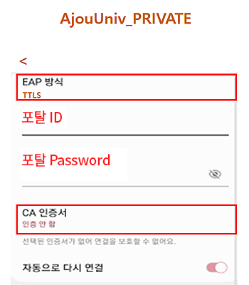 AjouUniv_PRIVATE – Android / EAP방식(TTLS),CA인증서(인증안함) 필수