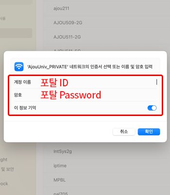 • 4. Wi-Fi SSID 목록 중 “AjouUniv_PRIVATE” 클릭
