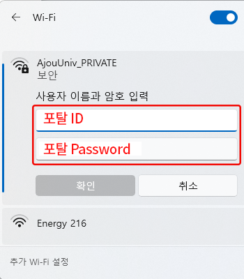 • 3. Wi-Fi SSID 목록 중 “AjouUniv_PRIVATE”,